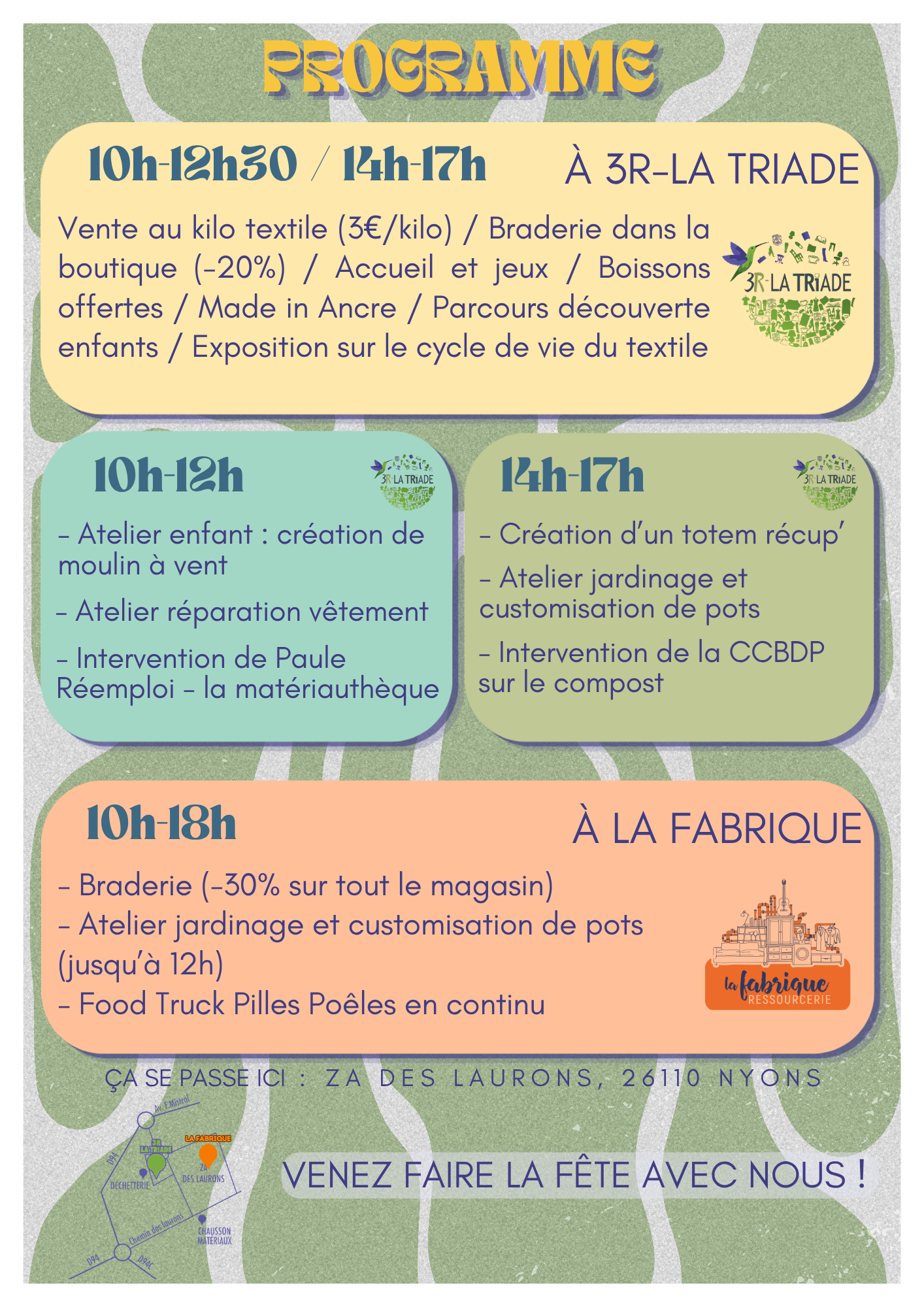 Pour la cinquième année consécutive, la ressourcerie 3R-La Triade fait la fête ! Cette année le samedi 25 avril nous vous proposons une grande journée pour célébrer la récup' sous toutes ses formes et déstocker nos articles. Nous organisons cette journée en partenariat avec La Fabrique pour faire de la zone des laurons à Nyons un grand marché des objets de seconde main.
